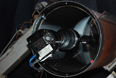The first images obtained after mounting an SBIG ST-8 on the kit were quite rewarding. The assembly, shown in the first photograph below,was made to come into focus at about 4-inches from the front of the glass corrector plate. I also noticed that a small lens had been placed a couple of inches in front of the corrector plate presumably to make some correction for spherical (or some other) aberration.